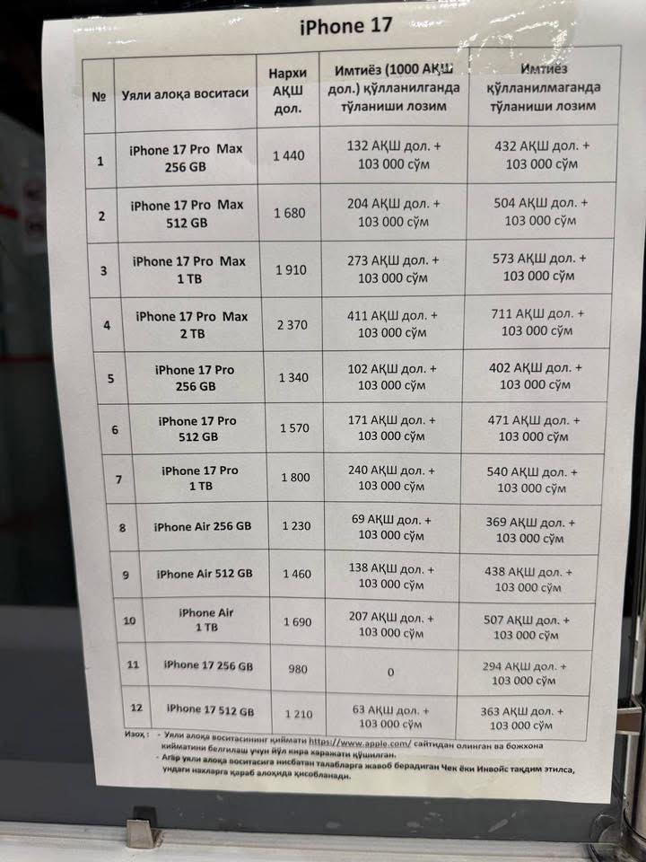 Vaib.uz (Узбекистан. 2 октября). На фоне недавней презентации новых айфонов и стремительно взлетевших цен на столичных рынках и в магазинах, соцсети наполнились обсуждениями: сколько будет стоить новенький iPhone 17, если купить его за границей и ввезти в страну официально, возвращаясь самолетом?