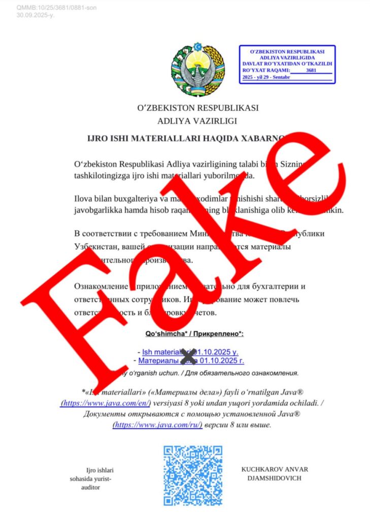 Vaib.uz (Узбекистан. 3 октября). В Узбекистане набирает обороты еще один способ мошенничества — массовая рассылка поддельных электронных писем. Всё чаще предприниматели и компании получают сообщения якобы от Министерства юстиции, где их пугают несуществующими проверками и блокировкой счетов.
