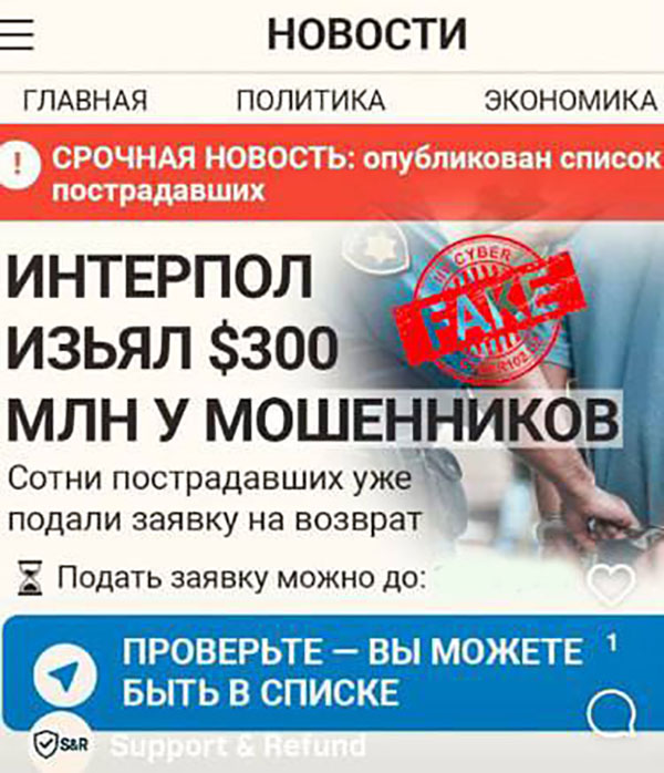В таких сообщениях говорится, что всем пострадавшим от мошенничества необходимо перейти по специальной ссылке, ведущей на фейковый сайт. Там предлагается пройти «регистрацию», указав персональные данные, прикрепив документы, якобы подтверждающие кражу, а также внести данные банковских карт.