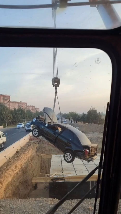 Vaib.uz (Узбекистан. 9 октября). Сегодня соцсети взорвали странные кадры из Янгиюля: здесь легковой автомобиль «Ласетти» каким-то образом оказался на дне огромного котлована, где началось строительство подземного перехода. Машина застряла так основательно, что доставать её пришлось с помощью строительного крана.
