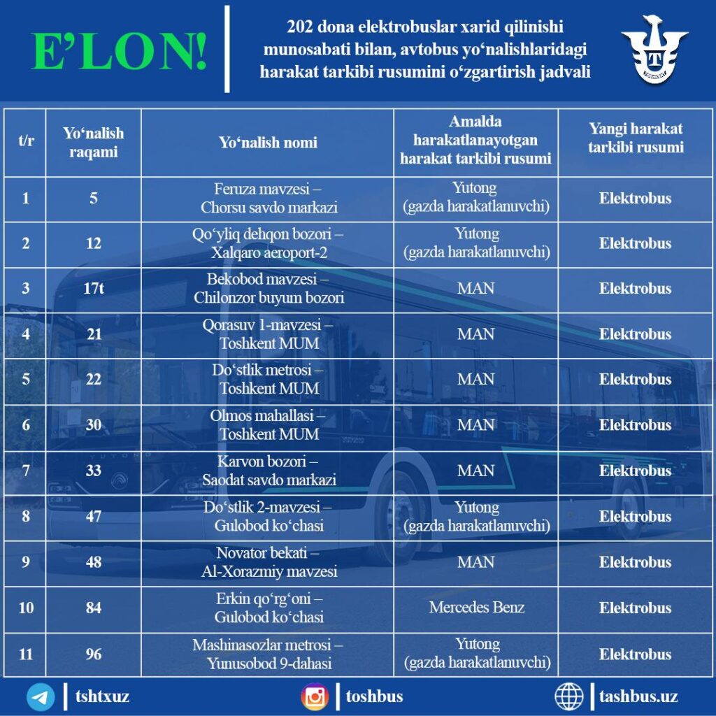 Vaib.uz (Узбекистан. 14 октября). Ташкент готовится к масштабной замене подвижного состава на городских маршрутах. В связи с поступлением 202 новых электробусов Yutong компания «Тошшахартрансхизмат» объявила о перераспределении транспортных средств на 33 автобусных маршрутах. Изменения затронут давно вызывающие жалобы пассажиров маршруты с перегрузкой и устаревшими автобусами.