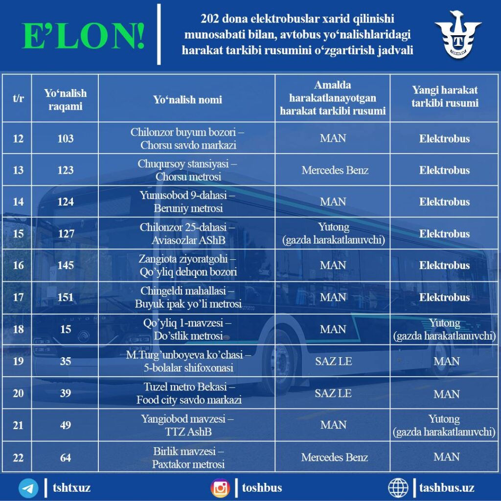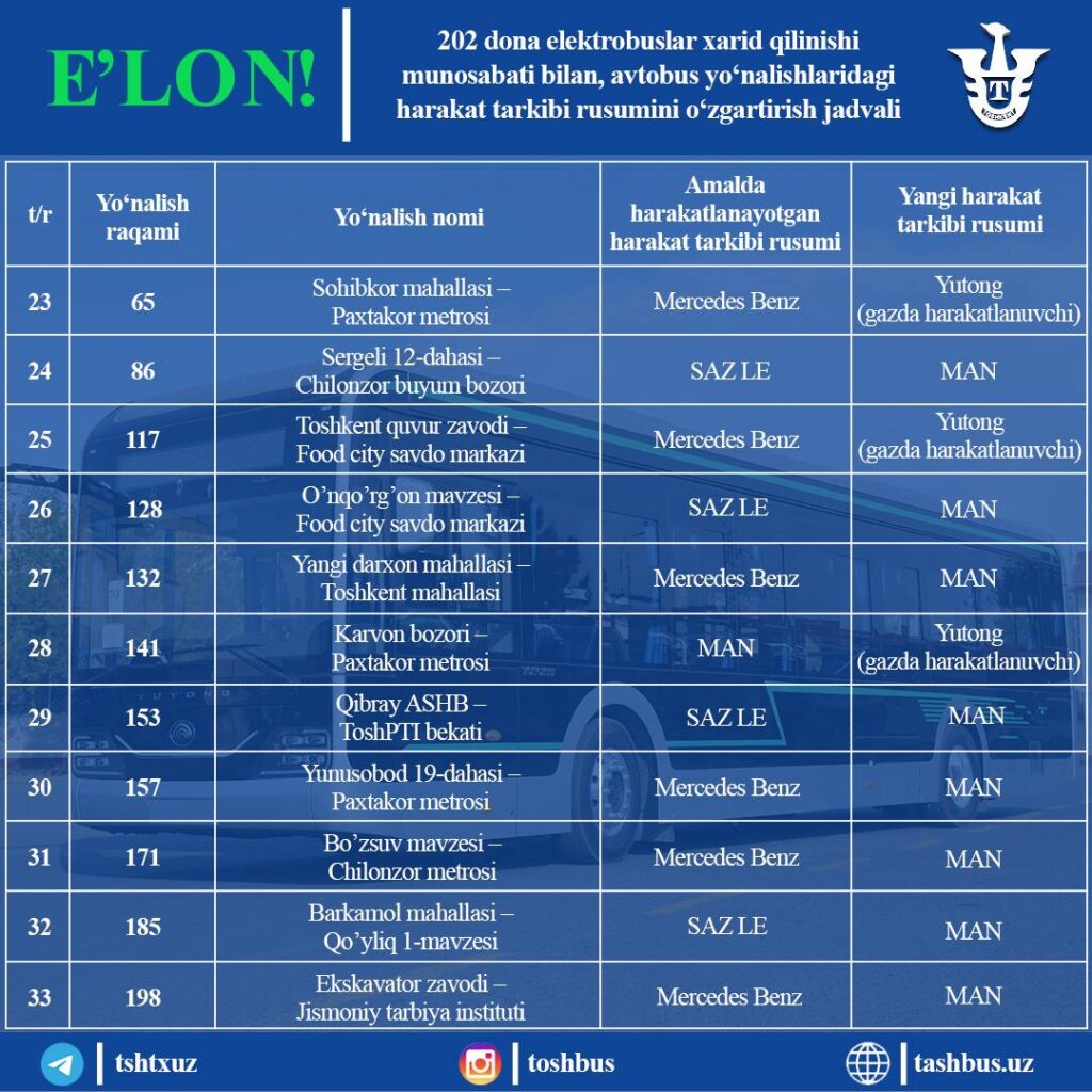 Пожалуй, самая радостная новость — постепенное избавление некоторых маршрутов от маленьких и тесных автобусов SAZ LE, произведённых в Самарканде. Эти автобусы давно стали предметом жалоб ташкентцев из-за тесноты, плохой вентиляции и общего дискомфорта.
