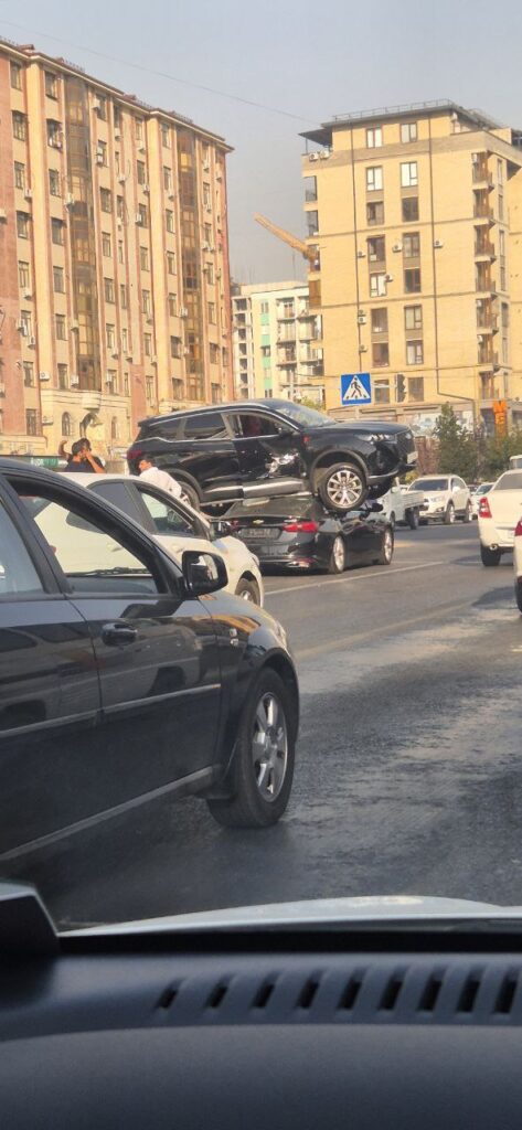 Vaib.uz (Узбекистан. 17 октября). Ташкент продолжает обсуждать необычное дорожно-транспортное происшествие, произошедшее на улице Махтумкули. Напомним, в соцсетях разлетелись фотографии и видео, на которых видно, как автомобиль Chery буквально стоит верхом на крыше Chevrolet Malibu. Это зрелище вызвало массу вопросов и шуток, но теперь появились видео, которые прояснили, как всё произошло.