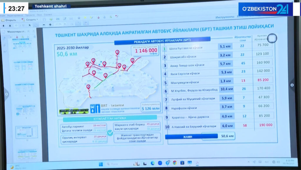 Vaib.uz (Узбекистан. 17 октября). Чиновники ташкентского хокимията поделились новыми подробностями о будущем проекте создания отдельных автобусных полос и внедрения системы BRT (Bus Rapid Transit) в столице. Масштабный проект рассчитан на период 2025–2030 годов и предусматривает строительство автобусных маршрутов общей протяжённостью 50,6 километра.