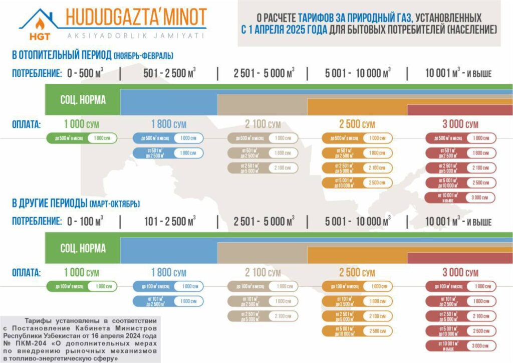 В рамках социальной нормы один кубометр газа стоит 1000 сумов. После превышения установленного лимита (с 501 до 2500 кубометров) тариф повышается до 1800 сумов за кубометр.