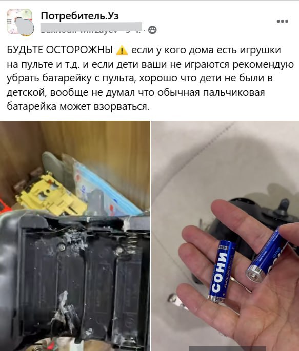 Vaib.uz (Узбекистан. 3 ноября). В сообществе «Потребитель.уз» разгорелась жаркая дискуссия после того, как одна из участниц рассказала странную и тревожную историю: у её ребёнка в пульте от пластмассовой машинки взорвалась батарейка «Сони». Осколки пластика разлетелись на метр вокруг. К счастью, ребёнка в этот момент рядом не было.