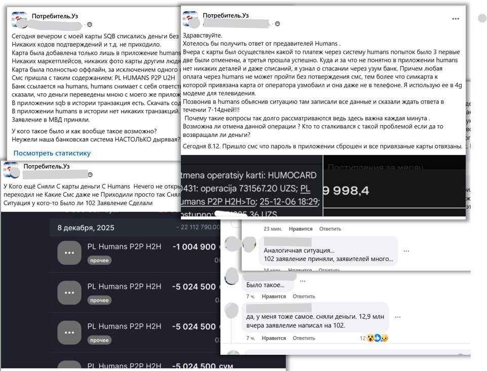 Vaib.uz (Узбекистан. 9 декабря). Сегодня соцсети буквально заполонили жалобы узбекистанцев, которые столкнулись с неожиданными списаниями денег с карт, привязанных к приложению Humans. Пользователи отмечали, что не устанавливали подозрительных программ и не передавали свои данные, однако средства начали внезапно исчезать. Ситуацию усугубляло то, что компания Humans официально никак не комментировала происходящее, демонстрируя явное равнодушие к проблемам своих клиентов.