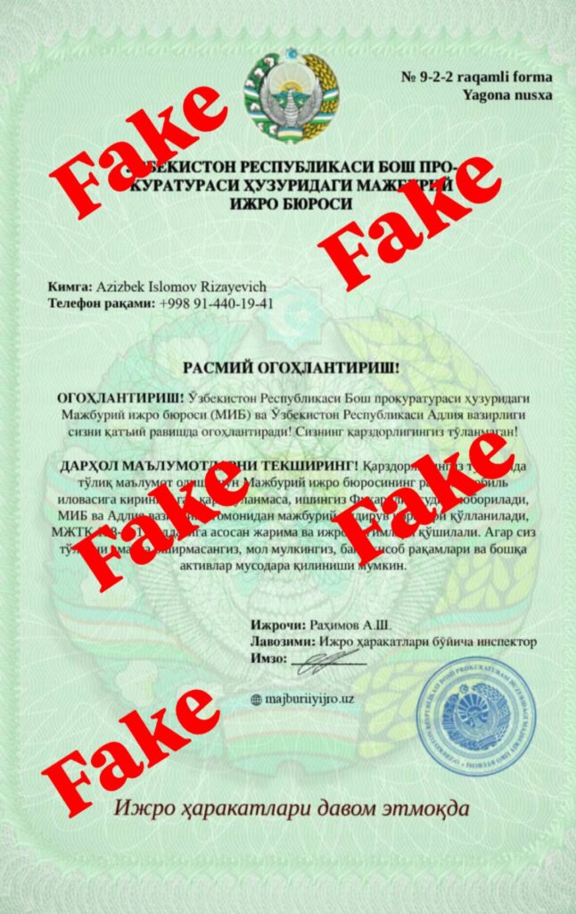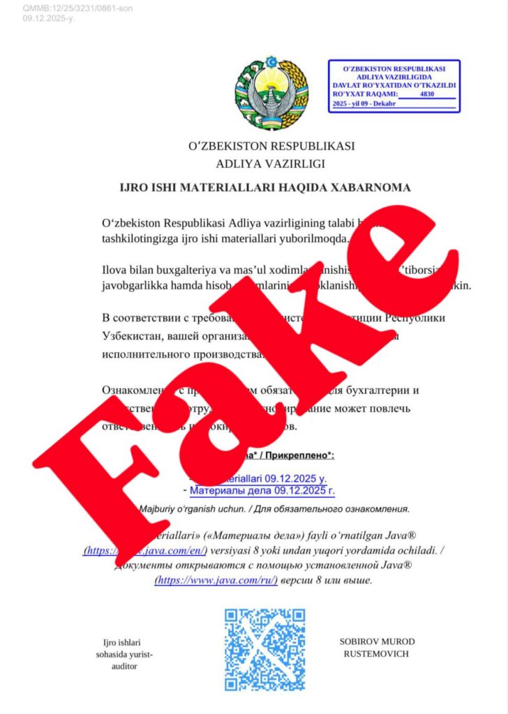 Vaib.uz (Узбекистан. 11 декабря). Министерство юстиции опубликовало новую подборку поддельных документов, которые мошенники массово рассылают пользователям в Telegram. Как правило, в таких письмах, якобы от лица государственных органов, содержится информация о «задолженностях», «судебных решениях», «предписаниях» и других важных событиях.