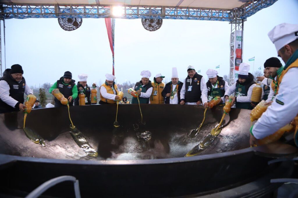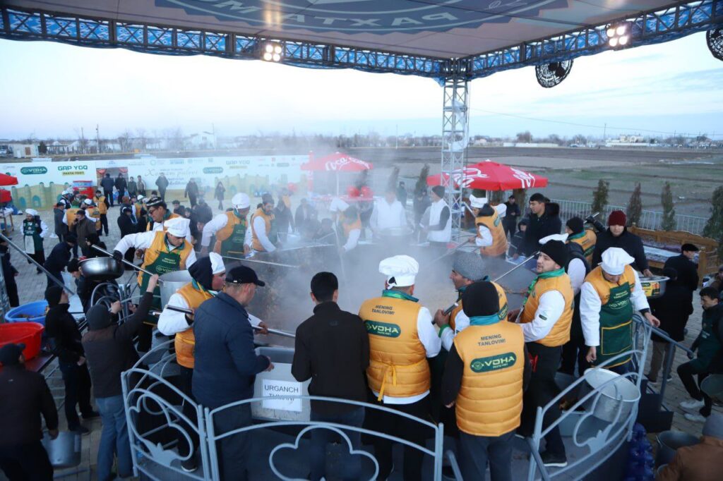 Гигантский казан стал настоящей звездой мероприятия, а процесс приготовления превратился в праздничное шоу. Тысячи гостей и жителей Хивы стали свидетелями этого масштабного события, а многие смогли попробовать свежеприготовленный плов.