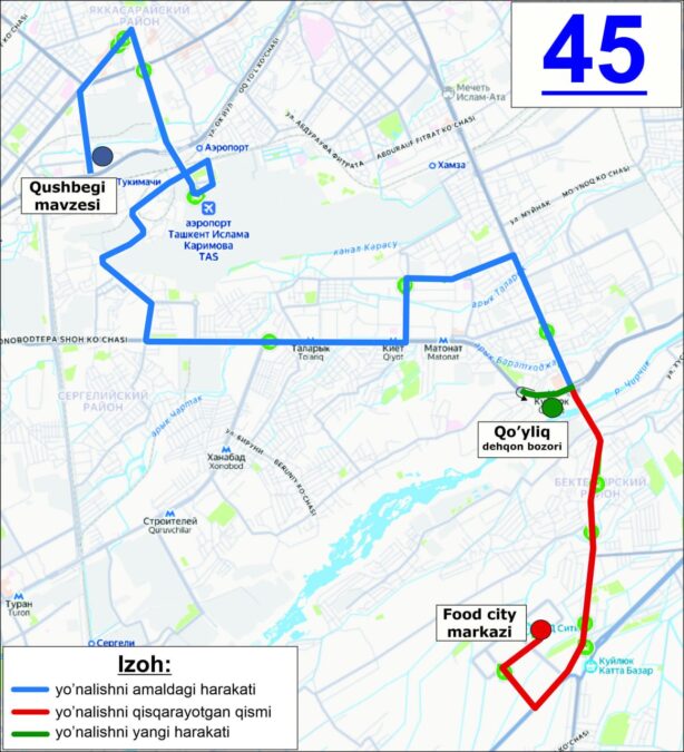 Маршрут №45 теперь будет курсировать по направлению «Массив Кушбеги – Дехканский рынок Куйлюк». Участок от рынка «Куйлюк» до торгового центра Food City будет сокращён.