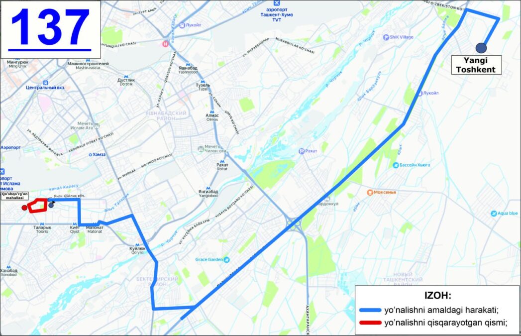 Изменения коснутся и маршрута №137. Его движение будет сокращено от махалли «Кушкоргон» до остановки «Улица Янги Куйлюк». Теперь автобус будет курсировать по направлению «Улица Янги Куйлюк – Янги Ташкент».