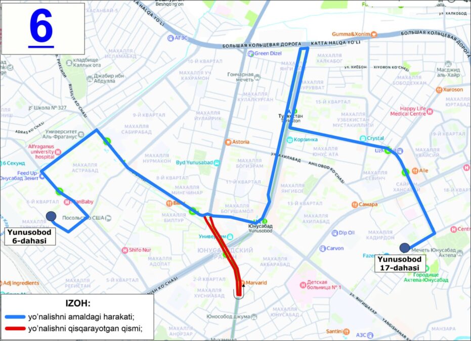 Также будет скорректирована схема движения маршрута №6 при следовании от массива Юнусабад-17 к массиву Юнусабад-6. Автобус будет двигаться по улицам Янги Шахар и Рихсилий без заезда на улицу Амира Темура.