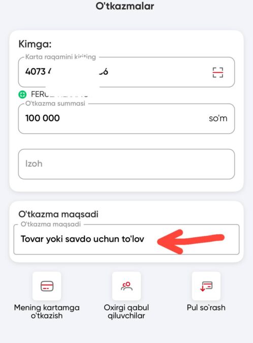 Vaib.uz (новости Узбекистана. 2 марта). Вам было мало нововведений вроде идеи ограничивать оплату электричества за долги по мусору или квартплате? Похоже, финансовая система готовит ещё одну «инновацию». В ближайшее время во всех платёжных приложениях должна появиться обязательная вкладка – «цель денежного перевода». Если пользователь не выберет цель, то перевести деньги на карту другому человеку он не сможет.