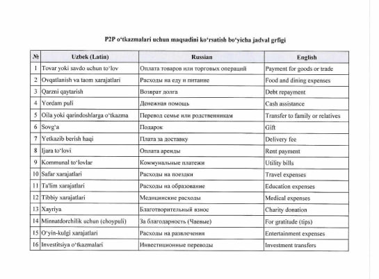 Как сообщил профильный телеграм-канал о банковской и налоговой сфере «Bank va Mijoz», Центральный банк направил коммерческим банкам и платёжным организациям указание обеспечить переводы через мобильные приложения только с функцией обязательного выбора «назначения перевода».