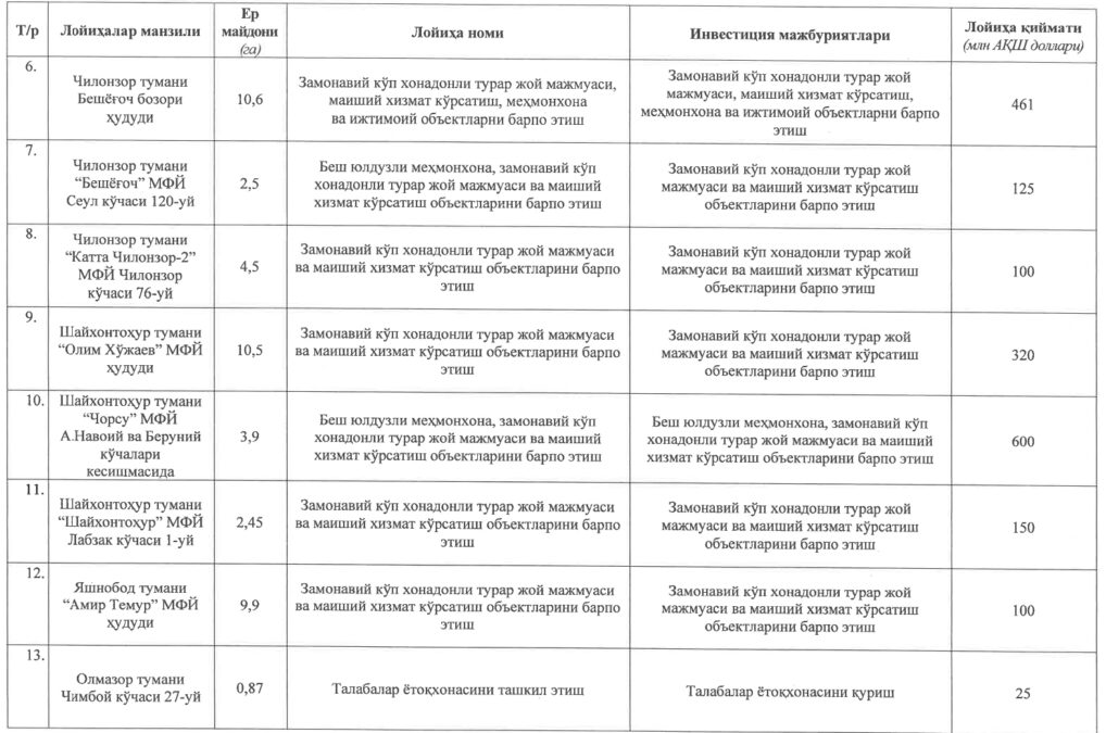 За счёт инфраструктурных платежей и других отчислений от строительных проектов компания Toshkent Invest планирует создать новые зелёные зоны сразу в девяти районах столицы. Речь идёт об общественных парках общей площадью 139,6 гектара.