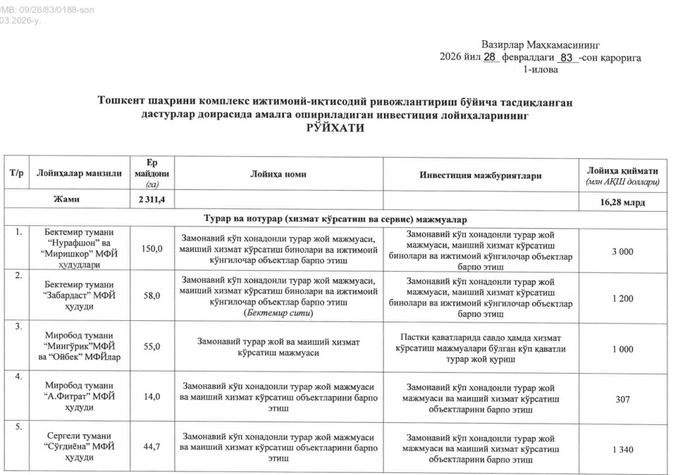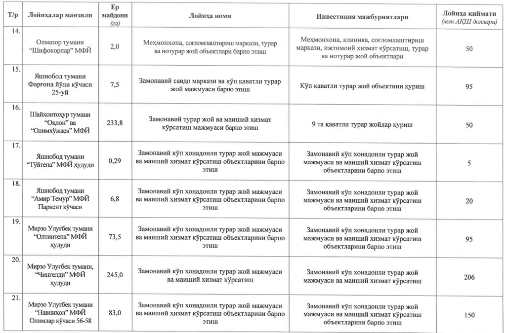 Vaib.uz (новости Узбекистана. 4 марта). Если вы думали, что Ташкент получит хотя бы небольшую передышку от масштабной застройки, – этого не будет. Правительство Узбекистана внесло изменения в генеральный план столицы до 2045 года. Согласно обновлённому документу, в городе планируется реализовать 30 крупных проектов в сфере недвижимости.