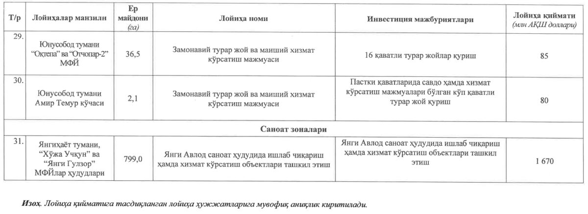 Также предусмотрено создание новой промышленной зоны. На территории махаллей «Хужа Учкун» и «Янги Гулзор» Янгихаётского района появится индустриальная площадка «Янги авлод» («Новое поколение»). Она займёт территорию 799 гектаров, а проектная стоимость её создания оценивается в 1,6 миллиарда долларов.