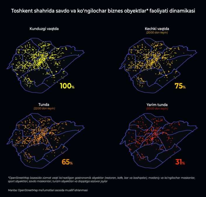 А вот дальше начинается тишина: Алмазарский и Яшнабадский – активность ниже средней, Учтепа, Сергели, Бектемир, Янгихаёт – фактически «спальные районы» без ночной жизни