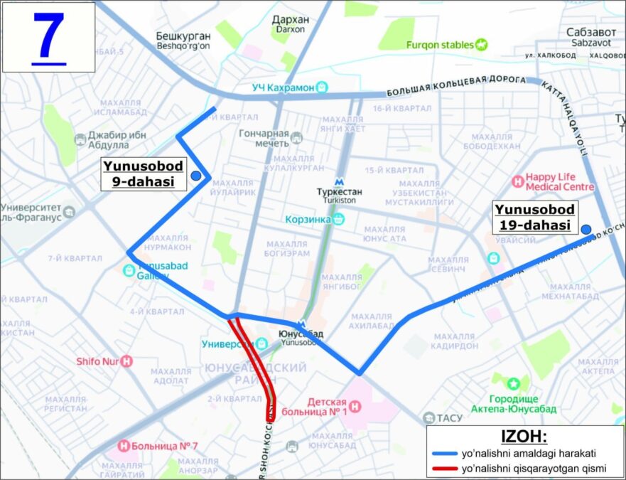 Теперь к маршруту №7. Тут тоже без сюрпризов – меняется схема движения на участке от Юнусабад-19 до Юнусабад-9. Автобус поедет через улицы Янги шахар и Рихсилий, минуя выезд на улицу Амира Темура.