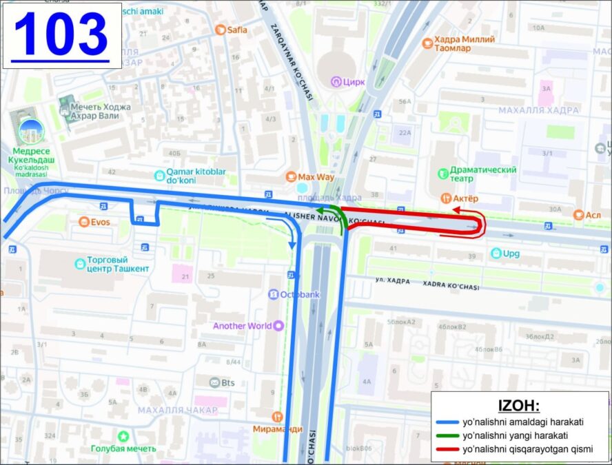 Кроме того, изменяется схема движения автобусного маршрута №103 «Вещевой рынок Чиланзар – Торговый центр Чорсу». На участке от улицы Фурката автобус больше не будет заезжать на улицу Алишера Навои и к остановке «Национальный драматический театр».