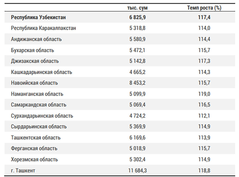 Дальше по списку: Навоийская область – 8,4 млн сумов, Ташкентская область – 6,1 млн. В среднем по стране – 6,8 млн сумов, что тоже на 18% больше, чем год назад.