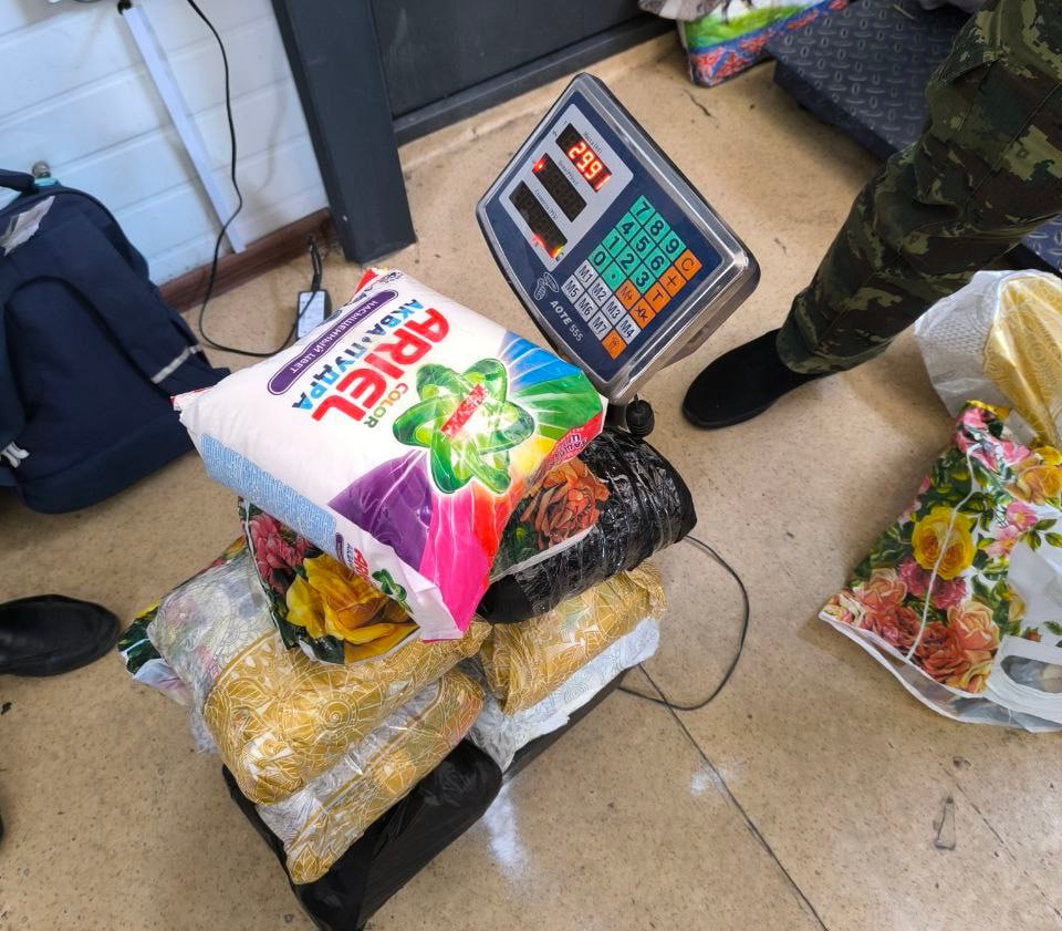 The first phase of the operation began at the “Dustlik” customs post. One of the passengers crossing the border on foot attracted the attention of customs officers. During the inspection of his hand luggage, which allegedly contained laundry detergent, a substance resembling the powerful drug “pregabalin” was found. A total of 33 kg of the substance, packed in 11 packages, was seized.